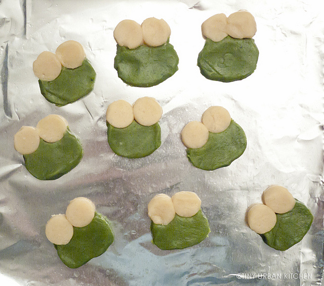 Similar to the Totoros, you also need two “colors” of dough – a green tea matcha one and a plain white one.