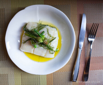 Home » Recipe » Olive Oil Poached Halibut with Garlic Spears and Fresh Peas (sous vide)