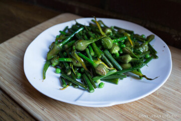 Home » Recipe » Olive Oil Poached Halibut with Garlic Spears and Fresh Peas (sous vide)
